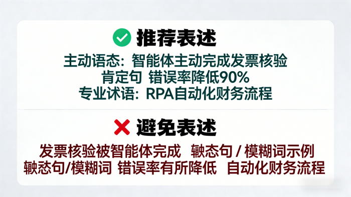 使用主动语态、肯定句等方式描述,提升信任度冲击力,使用显著提升、极大降低等,构建跟用户的信任度,适当使用RPA等专业属于名词+场景说明,既有技术范又能接地气。