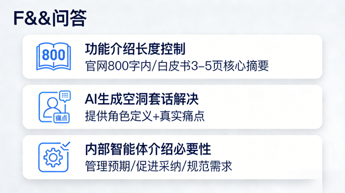 A3:同样需要,甚至更为重要。内部智能体的“客户”就是你的业务部门同事。一份清晰的功能介绍(内部可能叫“服务说明”或“使用指南”)能:
