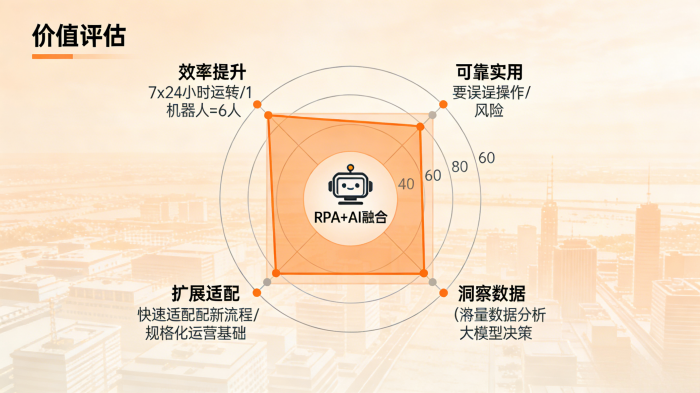 1、效率提升:处理速度快,能7x24小时运转,将员工从重复操作解放出来,一个机器人相当于6个人类;