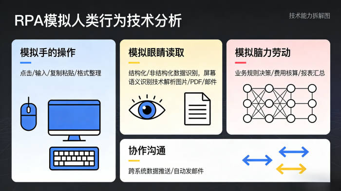 随着企业数字化转型的深入,RPA在其中扮演着越来越重要的角色,而且相对于传统的机器人流程自动化,现在结合Ai的能力,它已经演变成了有手脚能自主思考的“数字员工”。通过模拟人类在计算机上的操作行为,让大家从大量重复、有规则的事情中解放出来。不过,随着RPA+AI技术的升级,RPA能够模仿人类的行为也越来越多,不仅在基础工作上重塑了大家的工作模式,还能实现高价值工作。本文将从RPA技术原理出发,结合实在Agent,为您深度解读RPA在工作中的具体应用。