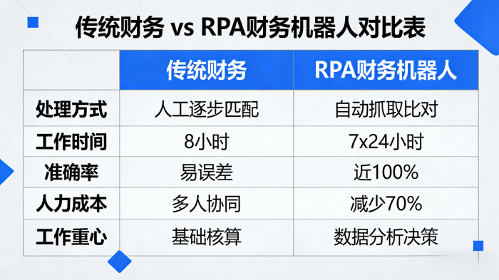 人工需要一个个逐步匹配,而RPA智能财务只需要自动化抓取和比对数据。