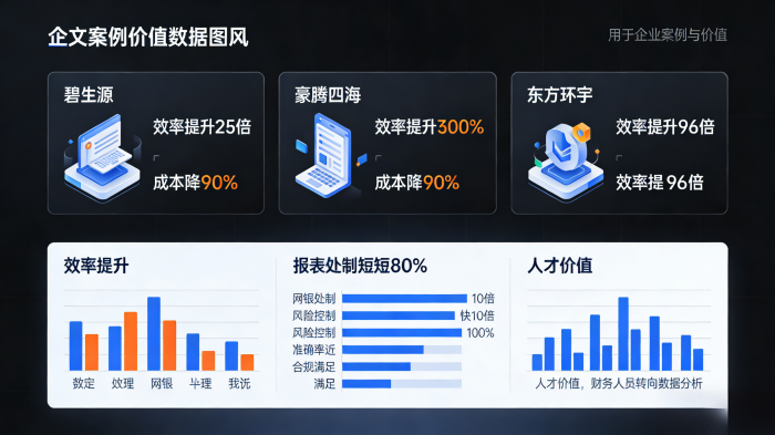 陕西焦煤使用的报表机器人编制时间缩短80%以上,碧生源的网银数据处理效率提升10倍;东方环宇销售统计效率提升96倍。