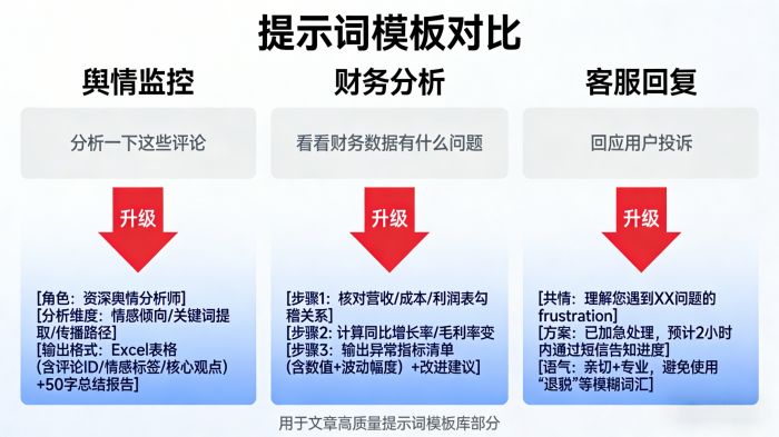 高质量提示词: “作为品牌舆情分析师,请分析以下用户评论:1. 识别每条评论的情感倾向(正面/负面/中性);2. 按产品功能、服务质量、物流体验、价格感知四个维度分类;3. 提取负面评论中的具体问题点;4. 以表格形式输出,包含原文摘要、情感分类、问题分类、具体问题四列。以下是示例格式:[示例]”