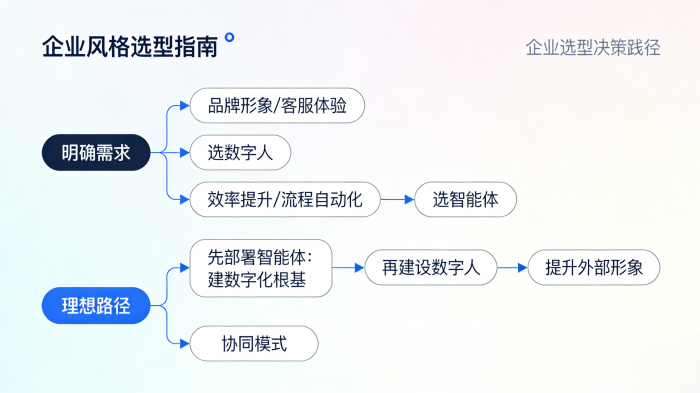 首先部署智能体,解决企业效率和准确性问题,建立数字化根基;然后在关键节点建设数字人,提升外部形象和客服体验,达成协同模式。