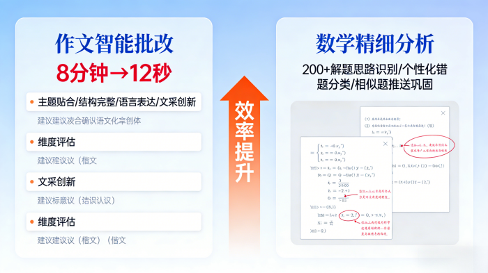 提供个性化即时反馈,在提交作业2分钟以内就可以获得详细批改结果和针对性建议,速度比传统提升50倍。