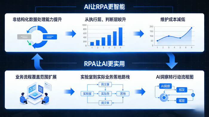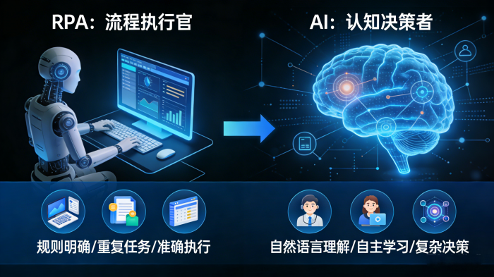 RPA需要人工不断调整以适应规则变化;AI能自动适应新场景,不断优化。