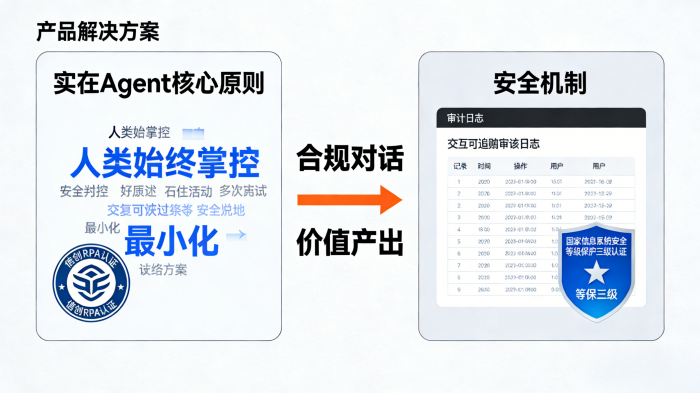 实在Agent把智能体的强大能力和审计机制相结合,全面支持信创RPA,并通过国家信息系统安全等级保护三级认证,确保每一次人机交互都可追溯、可审计。