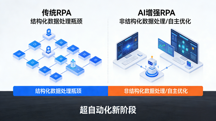 传统RPA擅长处理高度规则化和重复性的任务,如果流程中出现非结构化数据需要判断环节时,传统RPA就会遇到瓶颈。