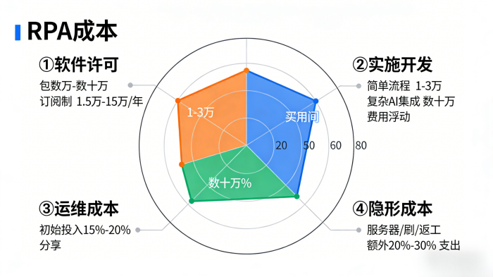 企业部署RPA所用的总成本,并非仅仅是采购软件,它不仅包含基础许可、开发实施还包含持续运维以及其他隐形支出,是一个动态构成的成本模型。