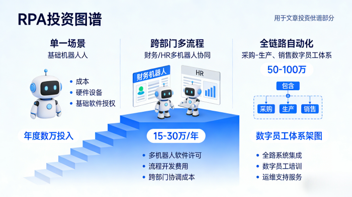 同时覆盖财务报销、人力资源等经典场景时,年度投资会上升到15-30万元,覆盖多机器人协同。