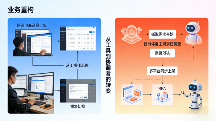 智能体作为驱动业务流程的基础操作层面,不再是被调用的工具,而是转化为任务分发和协调者。比如实在Agent运用在跨境电商中时,下载部署后会直接重构商品上架流程,自动捕获上新需求,智能体则能自主规划任务六,操控RPA在多个电商平台完成上架。
