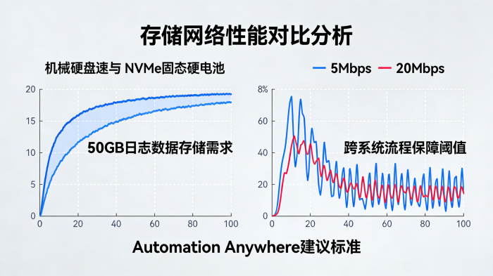 长流程往往会产生海量日志、截图、临时数据等,根据Automation Anywhere的建议,采用高性能NVMe固态硬盘,预留40-50GB空间,能够极大缩短流程文件读写的等待时间。