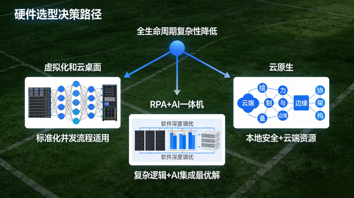 将流程编排和AI模型推理等重负载任务放在云端,而网络和合规要求的具体任务执行阶段则部署在本地边缘设备。此类架构下,本地硬件需求更侧重于运行稳定和安全性,复杂的资源则在云端无缝接入。