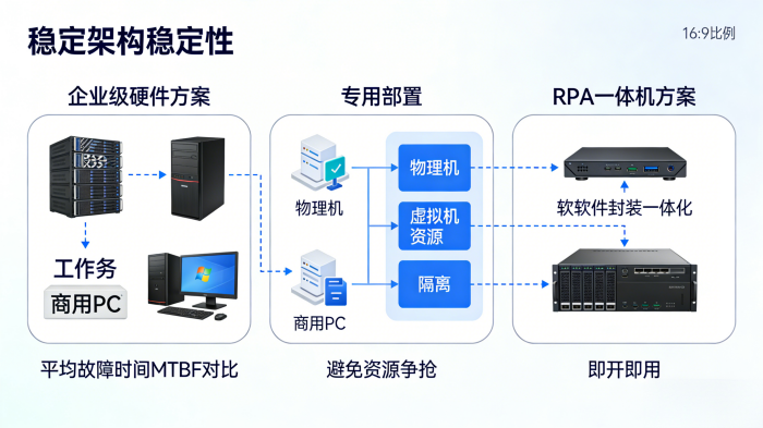 专用部署:为RPA机器人配置专门的物理机或者虚拟机,避免跟其他应用程序争抢资源,是保障稳定运行的基本线,更好的方案就是采用RPA一体机。