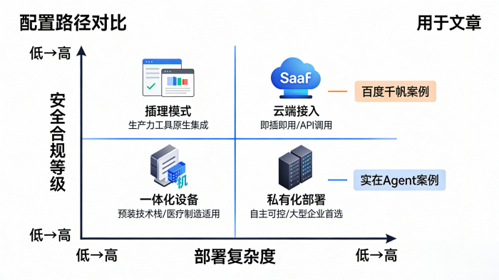 采用即插即用的SaaS部署方式,通过注册订阅智能体平台服务,调用API或者在线配置,就能直接接入智能体能力,而非下载。比如百度千帆,开发者通过获取API KEY就能获得专业能力集成。