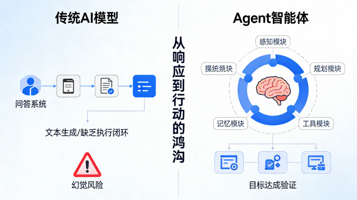 传统AI模型本质上是一套问答系统,通过接收、查询,生成文本、代码、图像或视频。而AI智能体则是一套“操作系统”,利用大模型作为核心中枢,将其键入到包含感知、规划、记忆、工具调用以及验证的闭环框架中。根本任务并不是一个看似合理的响应,而是通过可控制和审计的闭环,达成用户设定的端到端目标。