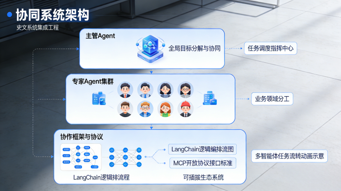 单个智能体的能力存在边界,面对繁复的业务流程,多个智能体协作系统是必然的走向。这就像一个数字化团队,不同智能体扮演专家,在“主管Agent”的调度下,协同工作,通过共享状态和传递结果达成全局目标。