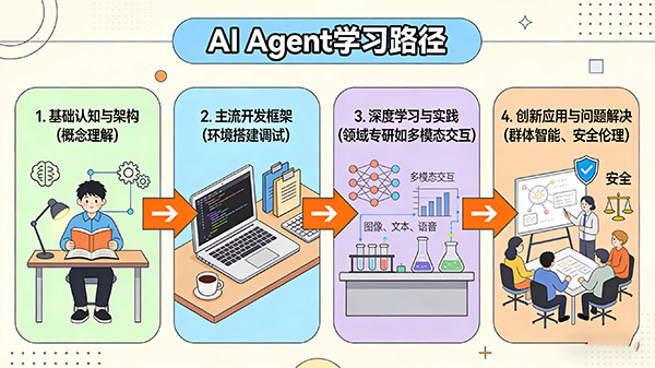 第四阶段:这个阶段就需要学习者有更多的创新性思维,可以关注群体智能、安全伦理等热点领域,并将学习到的知识运用到AI Agent问题解决上面。