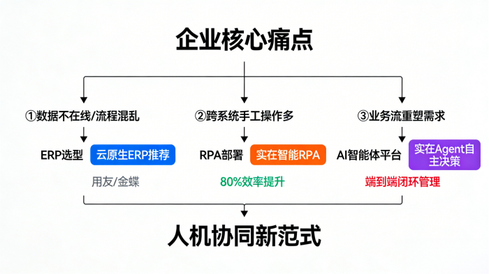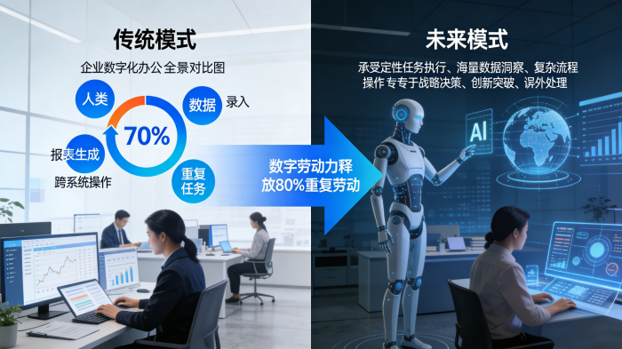 回顾从ERP到RPA,再到AI智能体的演进之路,它不再是为某个环节服务的冰冷工具,而是能够与业务共同生长、相互赋能的智能载体。未来的工作模式必将是人机协同:由智能体组成的“数字劳动力”网络,将高效处理所有可结构化的确定性任务,从海量数据中提炼洞察,并精准执行复杂操作。