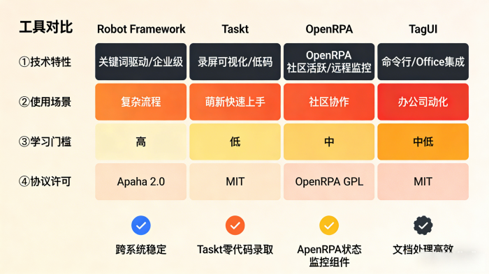 开源RPA就像一套高级乐高,给了技术团队低成本搭建自动化的可能。目前主流的几个框架,性格迥异,适合的场景也不同。