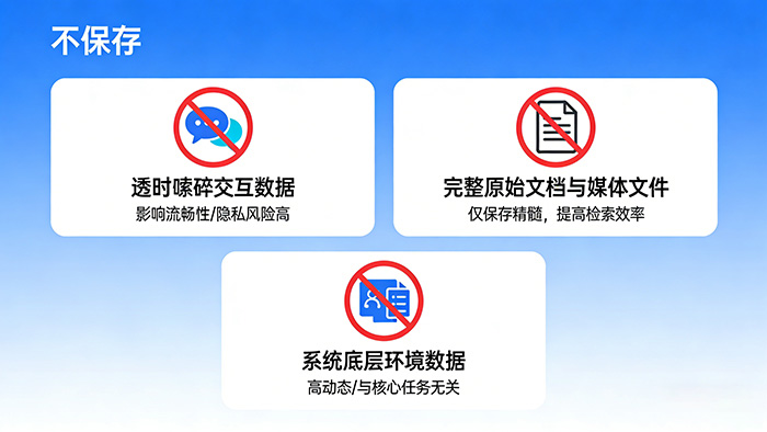 1. 瞬时、琐碎的交互数据不保存。保存这种数据会影响对话的流畅性。而且这种数据的价值参考性低的同时还有很高的隐私风险,所以不能保存。