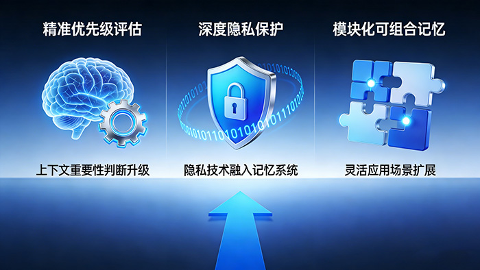 未来,智能体的长期记忆技术将会朝着更精准、更可控的方向发展。未来,智能体对上下文的重要优先级评估将更上一层楼,同时,对于隐私数据的保护技术将uhi深度的融入记忆系统,让智能体的使用更加安全可靠,并且智能体的记忆将会朝着模块化、可组合性发展,使智能体的应用更加灵活。