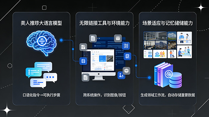 2. 无限链接工具与环境的能力,这种能力可以让智能体自动操作电脑屏幕上的各种软件,可以跨系统操作,能够识别各种图像、按钮等元素;