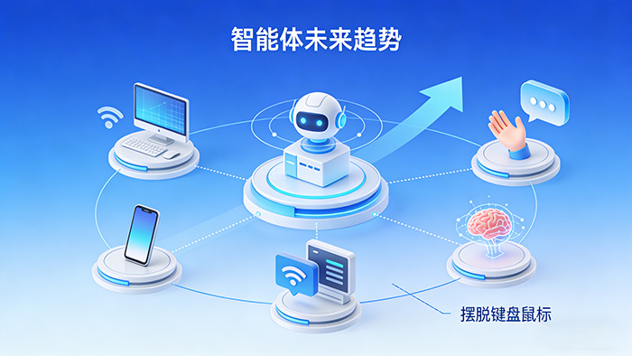未来,多智能体协同将会成为主流,智能体正在从电脑端向更多终端拓展。同时,智能体生成的提示词交互会更强,可能完全拜托键盘和鼠标,通过自然对话、手势甚至是脑机接口进行交互。