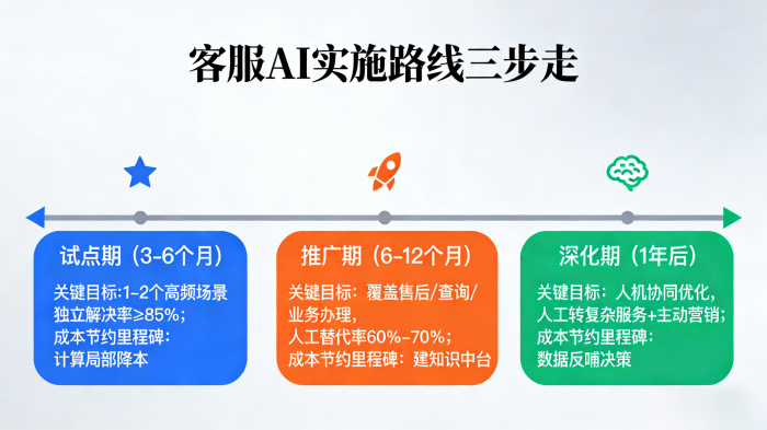 (一) 试点期: 精选1-2个高频、确定性高的痛点场景,配置专门的“场景化AI专员”重点突破。目标是在3-6个月内,实现该场景85%以上的独立解决率,并精确计算出局部降本效果,在内部建立信心。