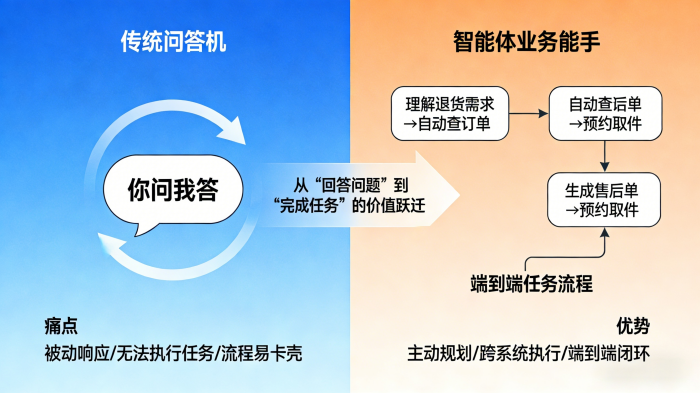 举个例子,用户说“我想退昨天买的手机,订单号是XXX”。智能体能做到:1)准确理解退货意图和订单信息;2)自动规划任务流程(验证订单、查退货政策、生成售后单);3)去调用内部的CRM、订单系统查询并创建工单;4)甚至自动发起退款审批,或者预约上门取件。你看,原本需要人工在多系统间反复切换处理的漫长流程,现在瞬间就能自动完成。