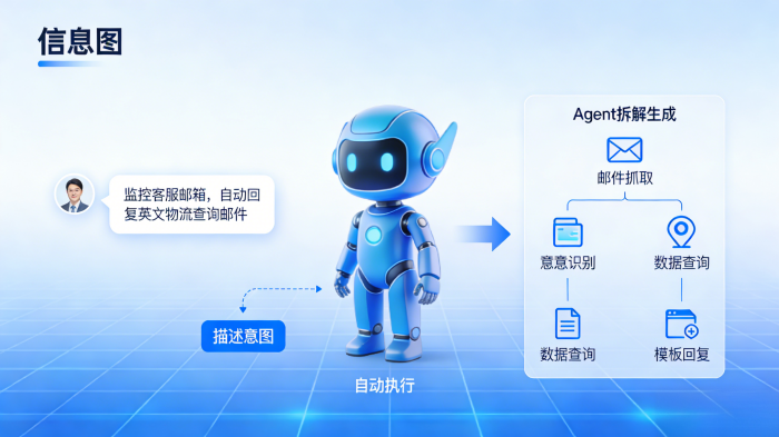 这正是实在Agent核心的 “一句话生成流程” 能力。其设计哲学极度强调 “易用” 。例如,无需复杂编程,运营人员只需用自然语言指令:“监控客服邮箱,自动识别所有关于‘物流状态查询’的英文邮件,从订单系统中找到对应物流单号,并用标准模板回复客户。” Agent便能尝试理解并构建出这个涵盖邮件抓取、意图识别、数据查询和自动回复的完整自动化流程。这极大地降低了跨境电商团队应用自动化的门槛。