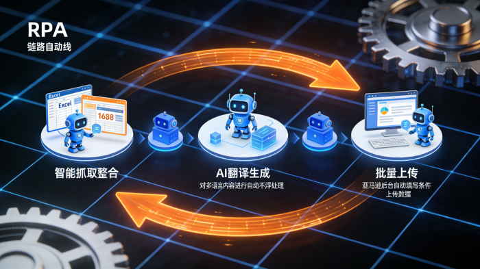 针对“亚马逊商品快速上架”这个核心目标,RPA可以化身为一条高效协作的自动化流水线,分解并攻克各个环节: