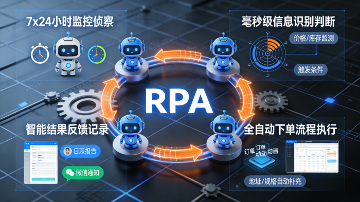 RPA(机器人流程自动化)技术,为解决这一问题提供了近乎完美的方案。你可以把它理解为一个能够模仿你在电脑上所有操作(打开网页、点击、输入文字、读取数据等)的“软件机器人”。将它应用于抢单场景,它就化身为一位不知疲倦、反应在毫秒级、绝对服从指令的“数字采购专员”。