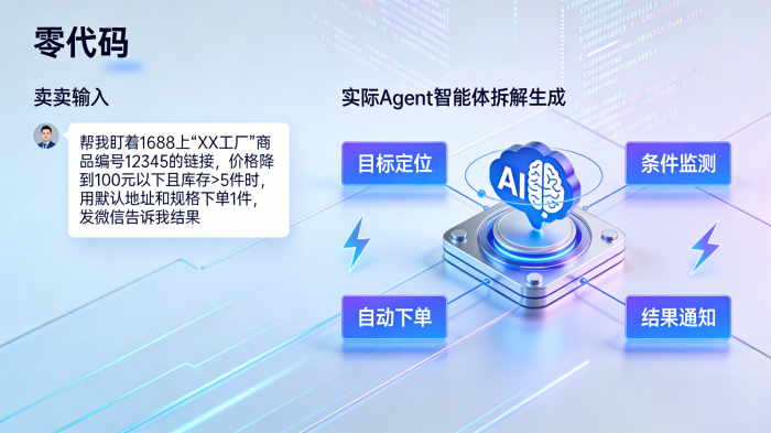 “一句话生成流程”的极致易用性:这正是“易用”的灵魂所在。你不再需要学习复杂的软件操作或逻辑流程图。假设你想监控1688上某个工厂的特定商品,你或许只需要对实在Agent用自然语言描述:“帮我盯着1688上‘XX工厂’店里商品编号为‘12345’的链接,如果它的价格降到100元以下,并且库存显示超过5件,就自动用我账号里的默认地址和规格下一件,然后发微信告诉我结果。”