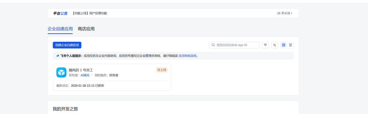1.打开飞书开放平台(https://open.feishu.cn/app?lang=zh-CN)创建飞书应用;