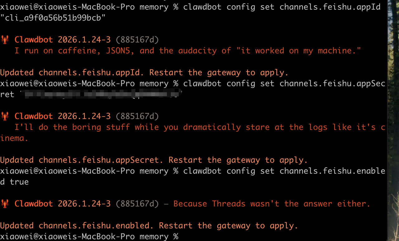 clawdbot config set channels.feishu.appId "cli_xxxxx" clawdbot config set channels.feishu.appSecret "your_app_secret" clawdbot config set channels.feishu.enabled true