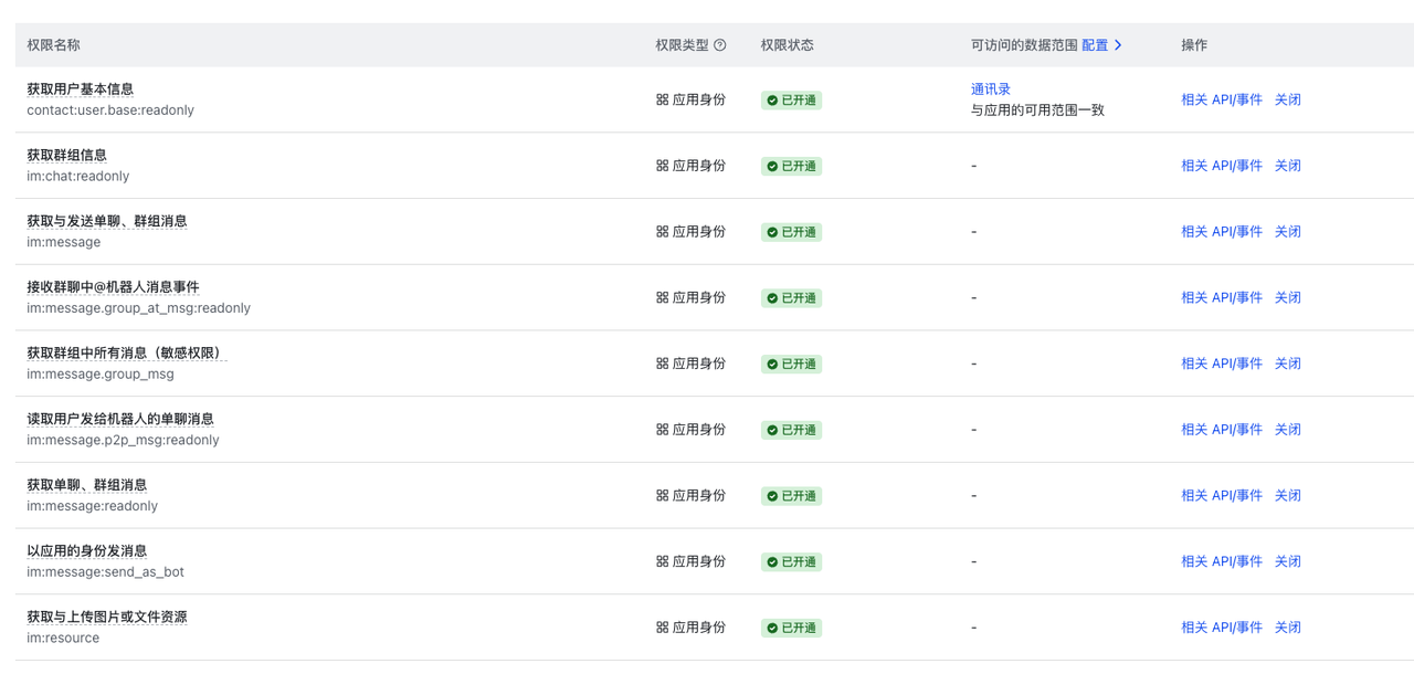 | im:message:send_as_bot | Send 发送 | Send messages as the bot 以机器人身份发送消息 |