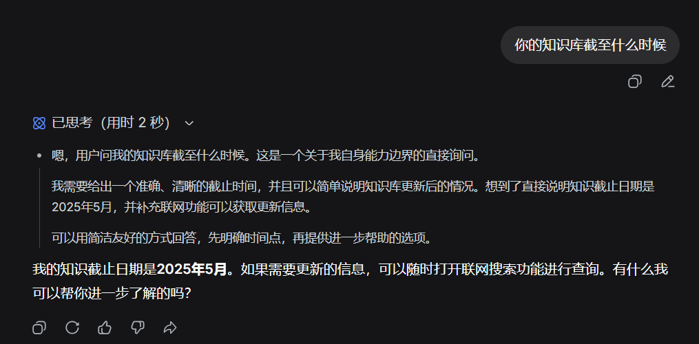 在对话中询问“你的知识库截止到什么时候?”,模型有时会给出 2023年10月 或更早的错误回答。