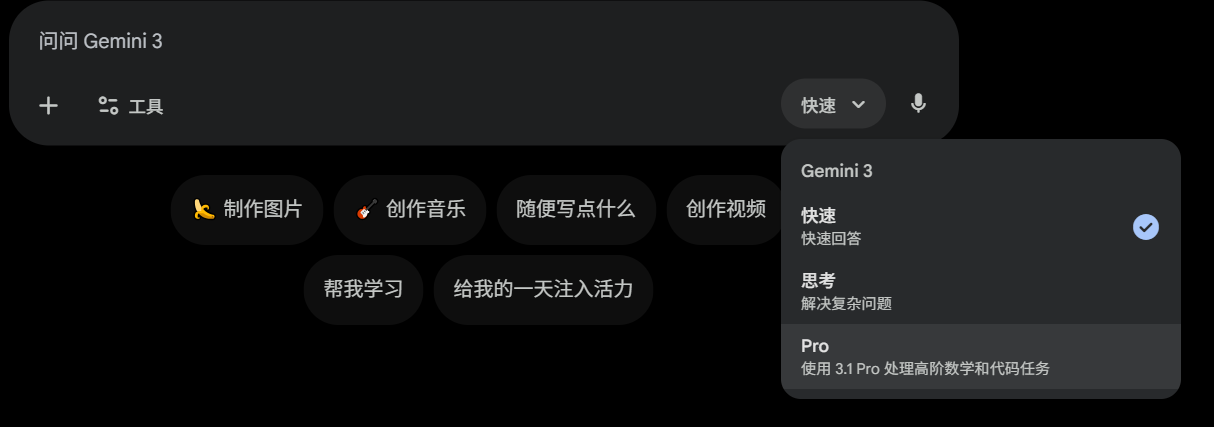 层级变量:Gemini 3.1 Pro 的完整能力绑定于付费层级(通常对应 Google One AI Premium 订阅)。如果在免费层级下,系统会默认调度基础模型。