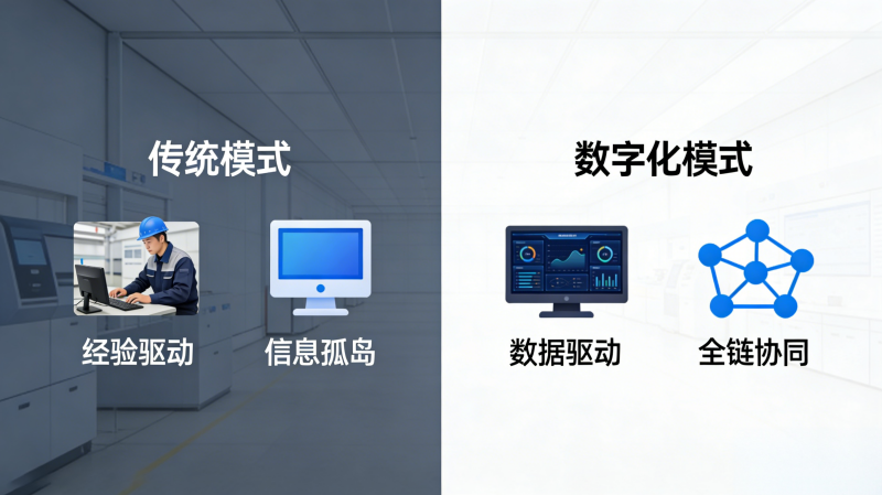 变量关系: 传统模式下,生产计划取决于班组长的经验;数字化模式下,排产由算法根据实时库存、设备稼动率与订单优先级自动推演。