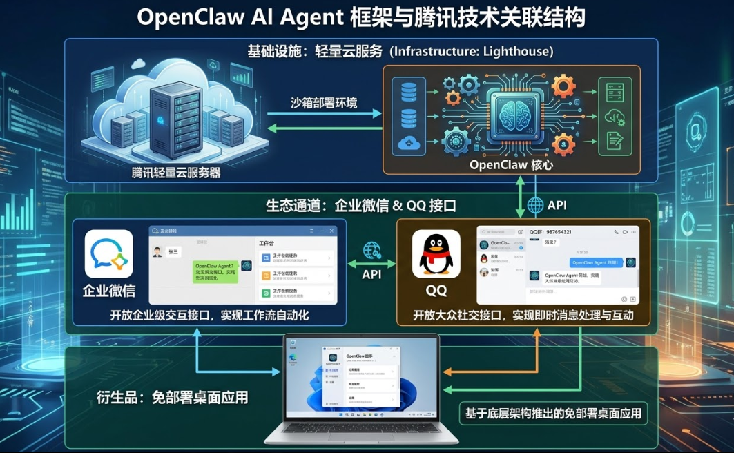 OpenClaw 是一款具备系统级操作权限的开源执行型 AI Agent 框架;腾讯与其技术关联主要体现为“基础设施+生态通道+衍生品”的承载结构,即通过轻量云服务器提供沙箱部署环境,开放企业微信与 QQ 的交互接口,并基于其底层架构推出了免部署的桌面应用。
