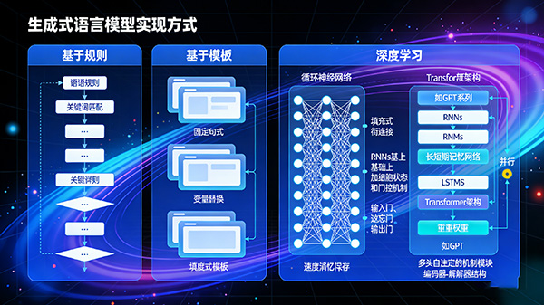 生成式语言模型有多种实现方式,包括基于规则的方法、基于模板的方法以及基于深度学习的方法;其中,基于深度学习的方法,特别是使用循环神经网络(RNNs)、长短期记忆网络(LSTMs)、Transformer架构(如GPT系列)等技术的模型,在近年来取得了显著的进展。