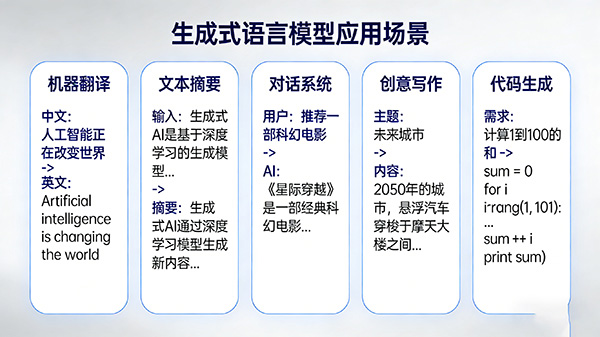 生成式语言模型的应用非常广泛,包括但不限于机器翻译、文本摘要、对话系统、创意写作、代码生成等;这些应用都需要模型能够根据给定的输入生成合理、自然且连贯的文本输出。