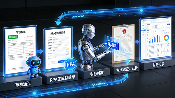 财务机器人依据付款规则执行付款操作,并自动生成凭证、提交凭证、过账,最终生成财务报告和分析报表。